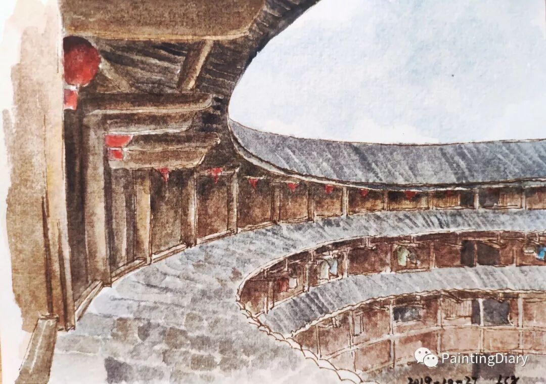今天画的是旅行归来的老李分享给小编的福建土楼,